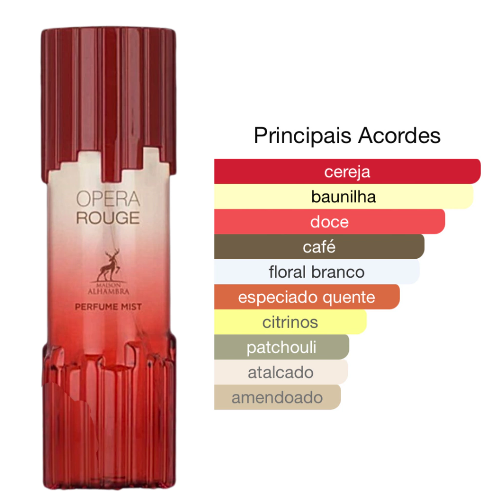 A pirâmide olfativa do Opera Rouge é complexa e harmoniosa, construída para se desdobrar gradualmente, revelando suas camadas opulentas. Inicia com um impacto vibrante e especiado, evolui para um coração floral e amadeirado, e se assenta em uma base quente e resinosa, garantindo uma fixação duradoura e uma silagem marcante.