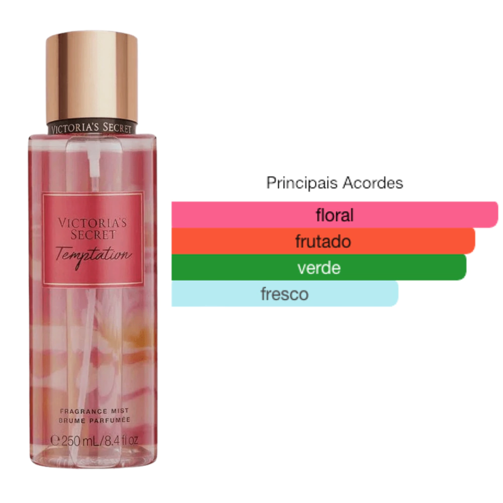Descrição do produto: O Temptation é uma fragrância floral frutada irresistível, projetada para quem ama o frescor das frutas cítricas e suculentas misturadas à delicadeza das flores. Ele traz uma combinação revigorante de maçã fresca e notas florais sutilmente doces, resultando em um aroma “limpo”, energético e extremamente sedutor. É o Body Mist perfeito para usar após o banho e sentir a pele renovada e perfumada por horas.